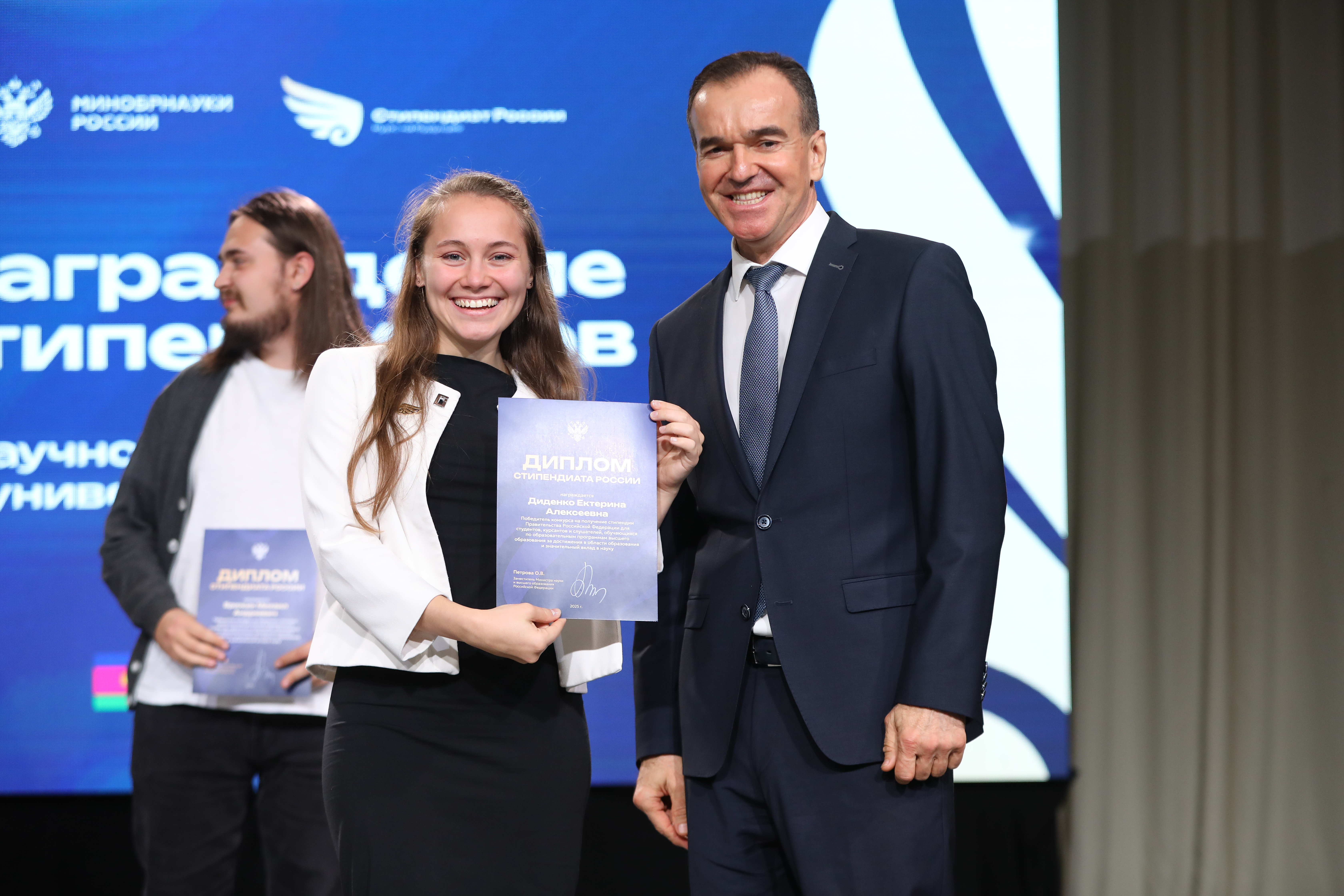 Программа «Стипендиат России: курс на будущее» организована Министерством науки и высшего образования РФ. Впервые мероприятие проводили по федеральным округам. Оно объединило лучших студентов страны – обладателей стипендий Президента и Правительства России. Размер стипендии Президента РФ — 30 тыс. рублей ежемесячно, стипендии Правительства РФ — 20 тыс. В Краснодарском крае стипендии лауреатам вручал губернатор Вениамин Кондратьев.